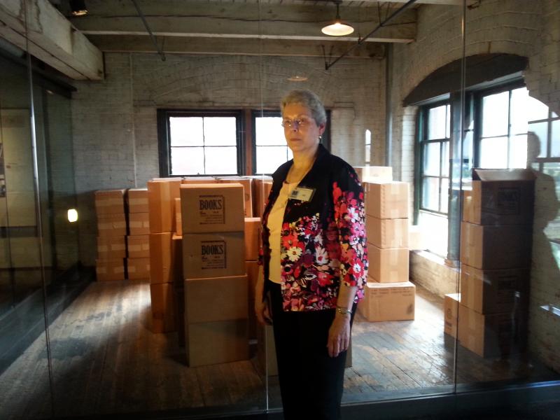 Nancy Myer on a visit to the Book Depository Museum in Dallas, Texas. In the background you are looking at the re-creation of the sniper's nest Oswald built to shoot President Kennedy from.